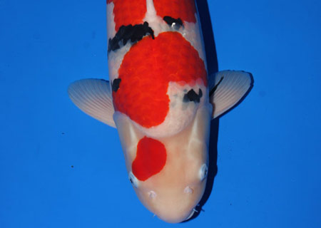 More commonly known as Sanke, are three coloured Koi with red and black (sumi) markings on a white background. A good Sanke must have a pure white background and uniform red and black markings. There should be no black markings on the head. The body should have large red markings complimented by an even distribution of smaller black sumi. For more information, see our Taisho Sanke page .