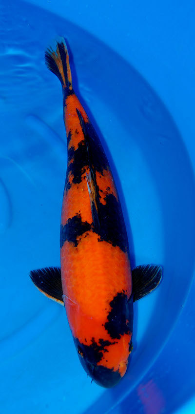 The Utsurimono (Utsuri) variety is comprised of 3 different two-colour koi. The Shiro Utsuri (black & white) is the most popular followed by the Hi Utsuri (red & black) and Ki Utsuri (yellow & black). Utsuri are black fish with either red white or yellow makings. Utsuri are sometimes confused with Bekko, however Bekko do not usually have any sumi (black) on the head, or below the lateral line