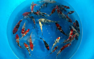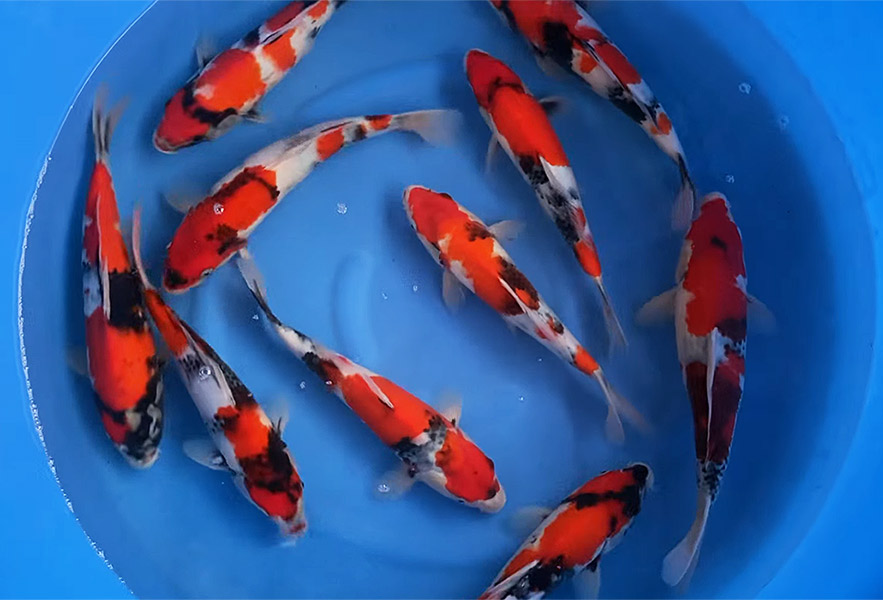 This box of Japanese koi from Nagashima Koi Farm is sure to please. This mix of 15-23 cm Tosai (1 year old koi) includes mostly Ginrin varieties, including Ginrin Showa, Ginrin Shiro Utsuri, Ginrin Kohaku and some Shiro Utsuri..