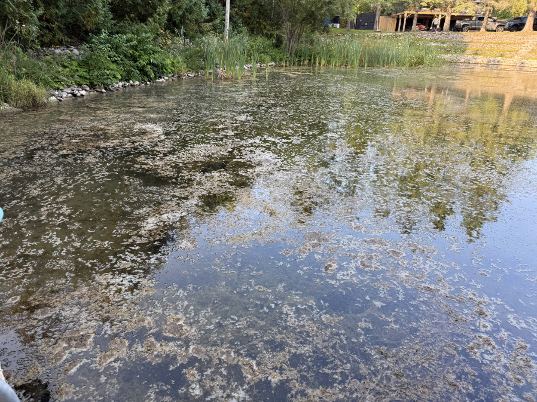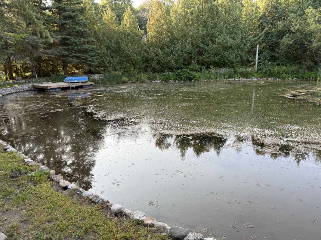 You can tell from the pictures that the owner takes great pride in maintaining the pond, however with the dry,  hot weather this past summer the amount of inflowing water dropped dramatically, the water temperature rose higher than usual and the weed and algae growth took off .